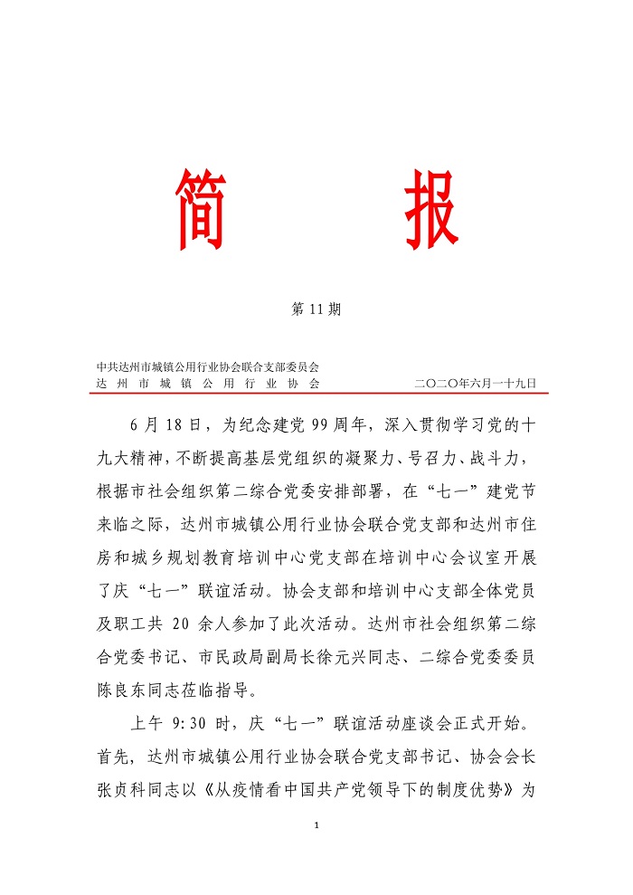 中共達(dá)州市城鎮(zhèn)公用行業(yè)協(xié)會聯(lián)合支部委員會2020年第十一期簡報