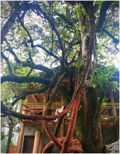 翌日,觀樹賞藤,另有一番收獲。覃家壩村掛牌保護(hù)的三十三棵古樹,述說著許多傳奇,既神話,又現(xiàn)實(shí)。聽說過嗎?樹與人相通?學(xué)生高考,大樹會為學(xué)子著急?還真有這么一棵狀元樹,這是一千八百年的香樟樹,每到學(xué)子高考前,老樹與學(xué)子一樣緊張憂慮,樹葉枯黃,若村子里有學(xué)子金榜題名,此樹立刻枝繁葉茂變綠復(fù)原。大家紛紛在這株希望之樹前留影、祈愿。