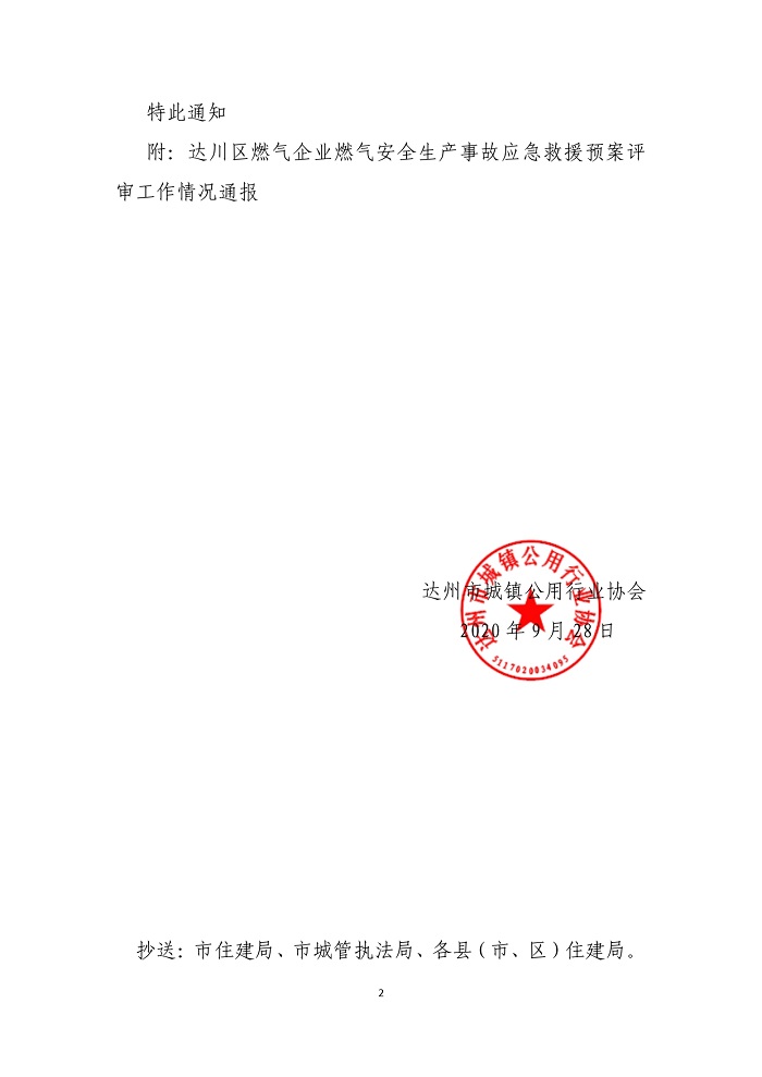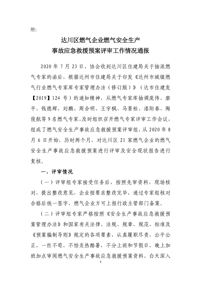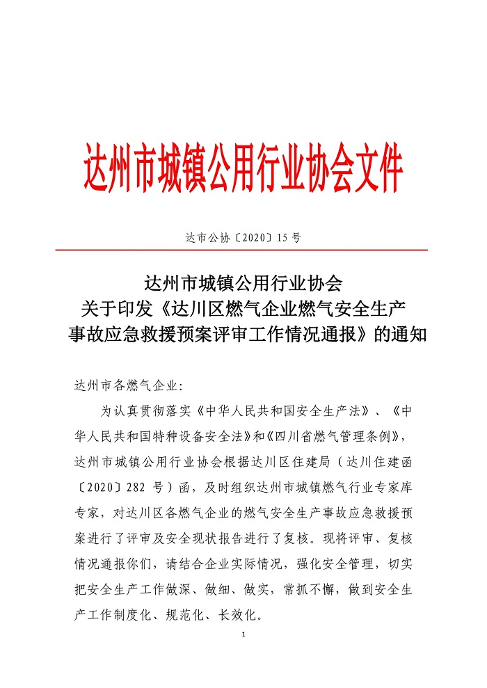 關(guān)于印發(fā)《達(dá)川區(qū)燃?xì)馄髽I(yè)燃?xì)獍踩a(chǎn)事故應(yīng)急救援預(yù)案評(píng)審工作情況通報(bào)》的通知