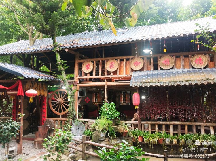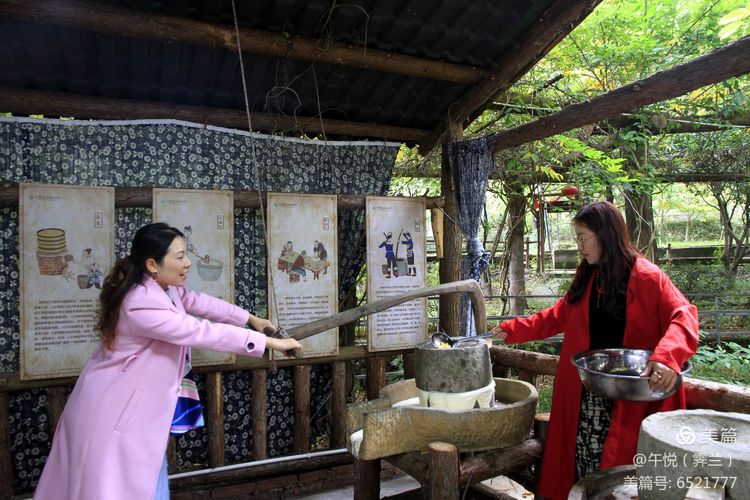 走進(jìn)農(nóng)耕文化苑,窗前串串金黃的玉米掛著豐收的喜悅,土車、簸箕、爬犁、木桶、扁擔(dān)、竹簍等無(wú)數(shù)農(nóng)耕文化的符號(hào)映入眼簾,還有復(fù)古的自行車、八仙桌、花轎,立刻讓人情不自禁地牽起懷舊的鄉(xiāng)愁;滴嗒竹雨順著屋檐散落池塘,抬頭一望,農(nóng)家咖啡塢的樓閣軒窗,佳人靜坐,聽雨冥想;民俗文化陳列館內(nèi),還有使人躍躍欲試的推磨、打豆?jié){、蒸饅頭的上陣體驗(yàn)。平日里難有鍛煉機(jī)會(huì),我趕緊與伙伴配合推磨,前傾、后仰丶伸展丶回拉,踩著節(jié)奏點(diǎn)找找感覺,熱熱身,出出汗吧?吹郊庸ず蟮募Z食作物演變出的勞動(dòng)成果,在熱氣騰騰的勞作清香之中,心兒都醉了,食欲也大大打開了。