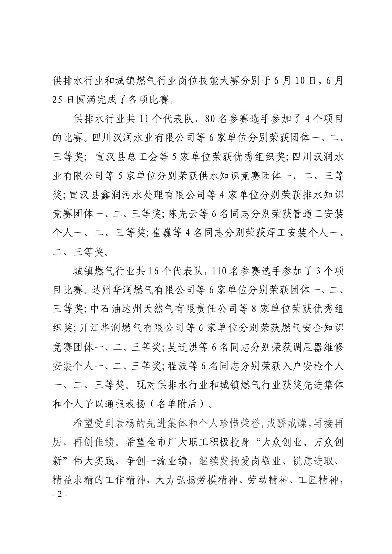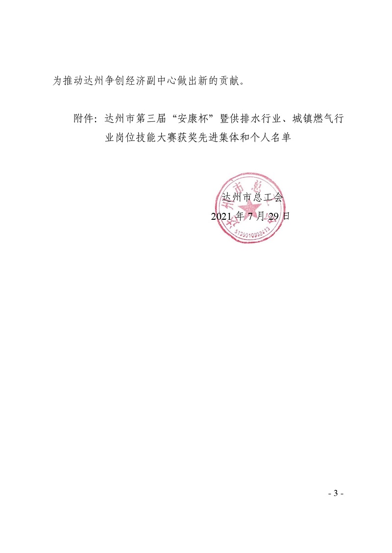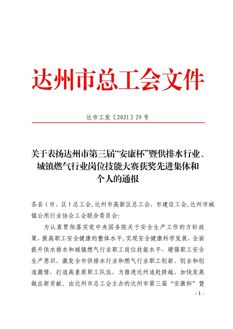 關(guān)于表?yè)P(yáng)2021年第三屆全市安康杯暨供排水行業(yè)、城鎮(zhèn)燃?xì)庑袠I(yè)崗位技能大賽獲獎(jiǎng)先進(jìn)集體和個(gè)人的通報(bào)達(dá)市工發(fā)〔2021〕29號(hào)