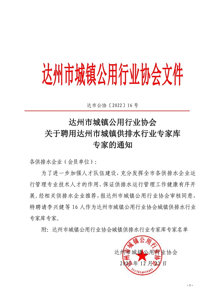 達(dá)州市城鎮(zhèn)公用行業(yè)協(xié)會(huì)關(guān)于聘用城鎮(zhèn)供排水專(zhuān)家的通知
