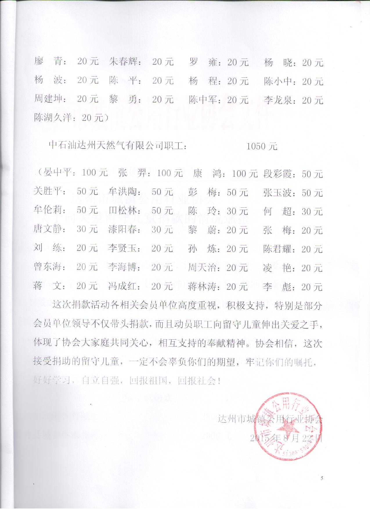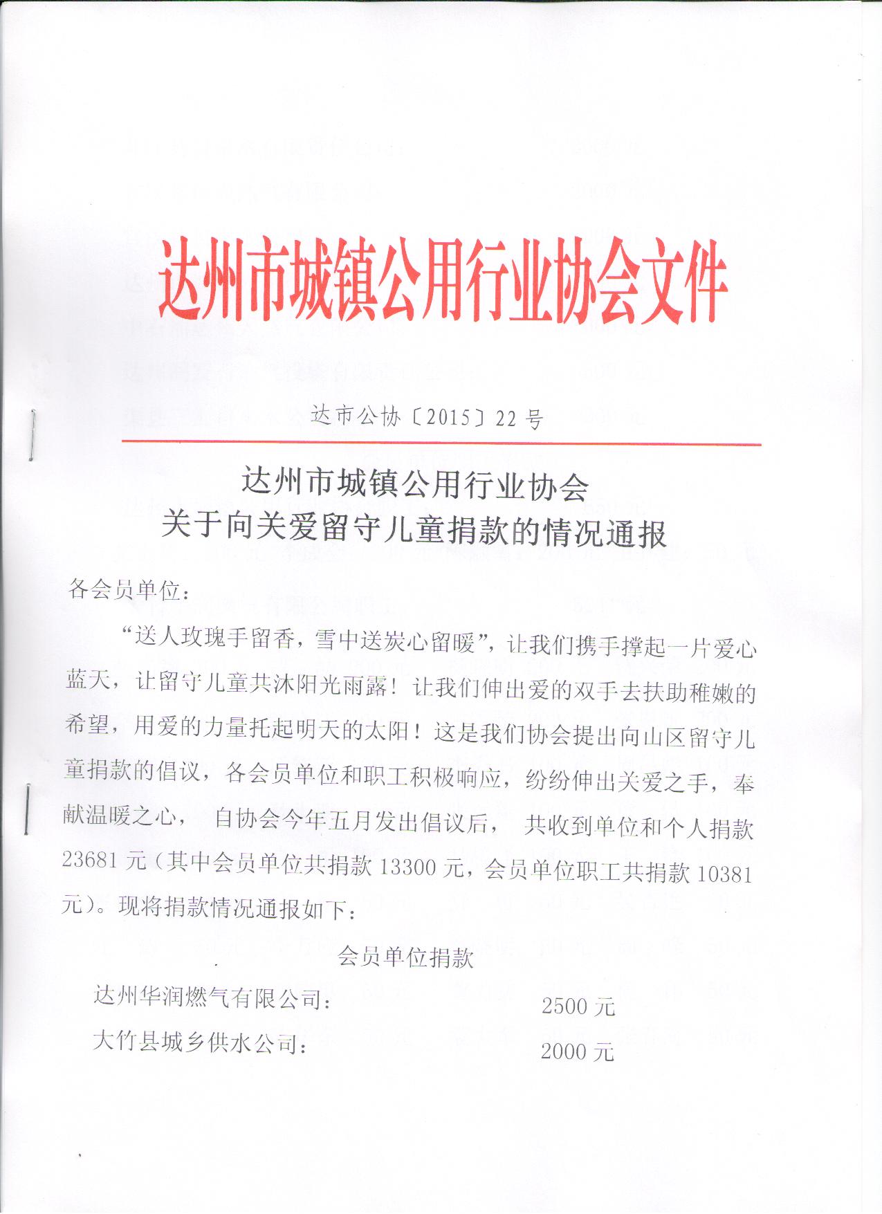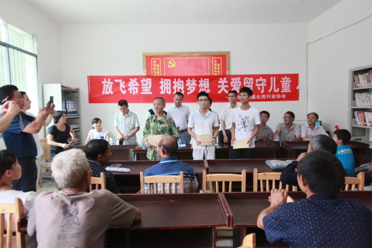 2015年8月25日,達州市城鎮(zhèn)公用行業(yè)協(xié)會組織的“放飛希望,關(guān)愛留守兒童”捐助活動,在宣漢縣南壩鎮(zhèn)雙柏社區(qū)村委會舉行,參加本次活動的有達州市城鎮(zhèn)公用行業(yè)協(xié)會會長張貞科,達州市住建局科長、宣漢縣南壩鎮(zhèn)雙柏社區(qū)黨支部第一書記張友德,達州華潤燃?xì)庥邢薰究偨?jīng)理何勇,大竹華潤燃?xì)庥邢薰靖笨偨?jīng)理饒興榮,大竹縣城鄉(xiāng)供水公司黨總支書記王文友,宣漢縣自來水公司水廠廠長向旭東,宣漢和信天然氣有限公司辦公室主任劉紅琴,宣漢縣南壩鎮(zhèn)副鎮(zhèn)長譚坤蜀,宣漢縣南壩鎮(zhèn)雙柏社區(qū)黨支部書記呂云建。捐助儀式由協(xié)會秘書長李成會主持,首先宣漢縣南壩鎮(zhèn)雙柏社區(qū)黨支部書記呂云建致辭,他對達州市城鎮(zhèn)公用行業(yè)協(xié)會組織的“放飛希望,關(guān)愛留守兒童”捐助活動和各企業(yè)單位及職工的善舉表示衷心感謝。達州華潤燃?xì)庥邢薰究偨?jīng)理何勇代表捐助企業(yè)和職工講話,留守兒童代表發(fā)了言。捐助活動儀式上,各位領(lǐng)導(dǎo)分別為30名留守兒童和3名貧困大學(xué)生發(fā)放慰問金和書包,(現(xiàn)金和書包折合人民幣23686元),最后協(xié)會會長張貞科指出,青少年是祖國的未來,民族的希望。關(guān)心下一代健康成長是全社會的共同責(zé)任,尤其是留守兒童、流動兒童和貧困家庭兒童是社會的弱勢群體,更需要社會的關(guān)愛和幫助,用愛的雙手托起他們的翅膀,激勵他們努力學(xué)習(xí),堅定對未來美好生活的信心,使他們在溫暖的陽光下茁壯成長。
