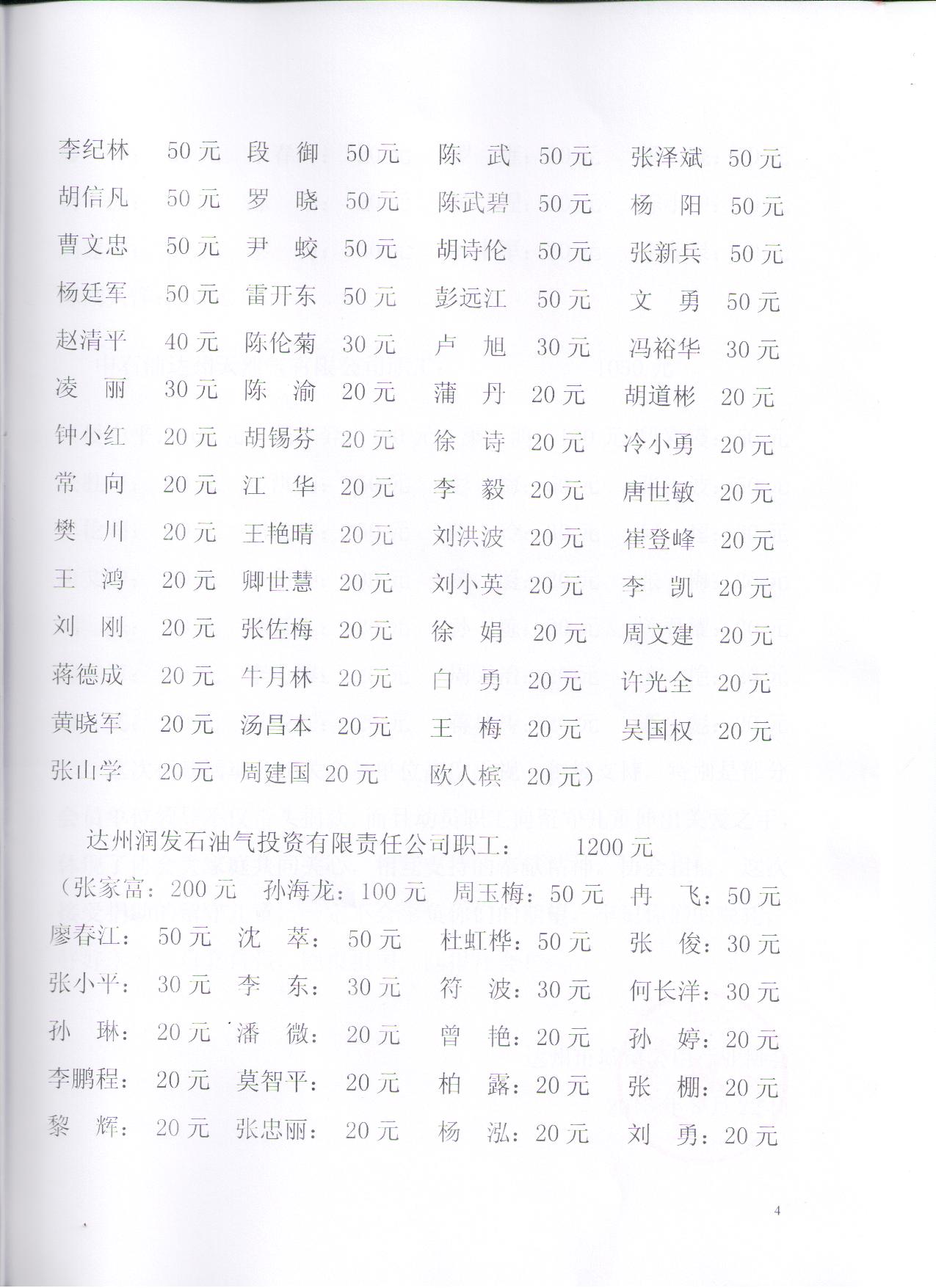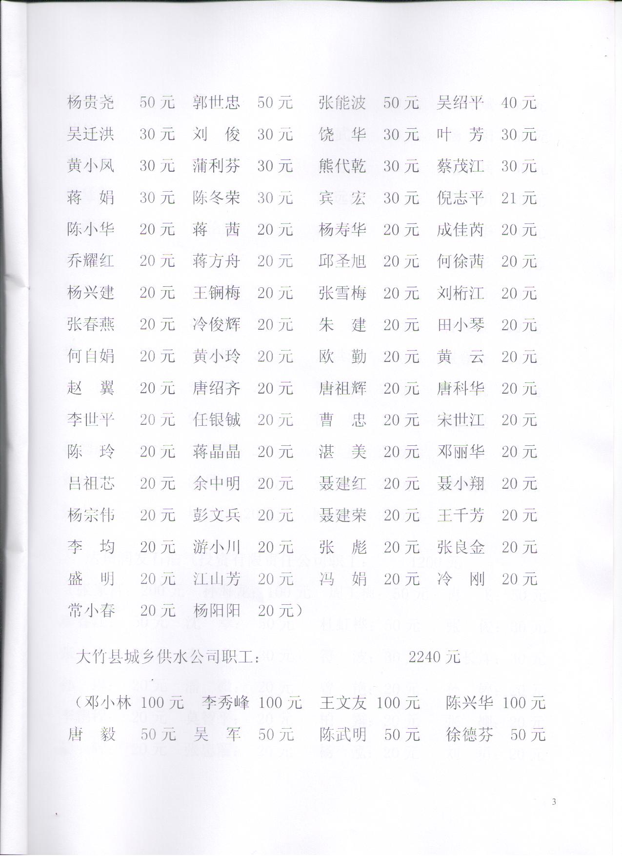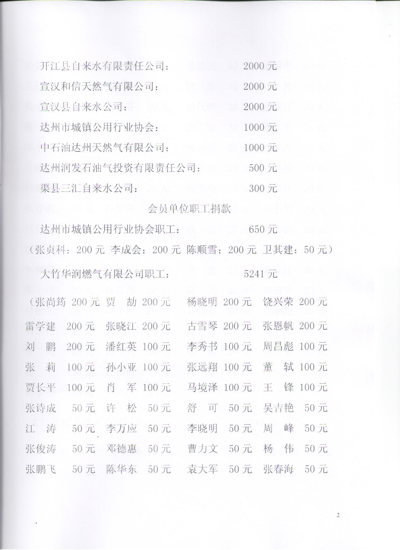 2015年8月25日,達州市城鎮(zhèn)公用行業(yè)協(xié)會組織的“放飛希望,關(guān)愛留守兒童”捐助活動,在宣漢縣南壩鎮(zhèn)雙柏社區(qū)村委會舉行,參加本次活動的有達州市城鎮(zhèn)公用行業(yè)協(xié)會會長張貞科,達州市住建局科長、宣漢縣南壩鎮(zhèn)雙柏社區(qū)黨支部第一書記張友德,達州華潤燃?xì)庥邢薰究偨?jīng)理何勇,大竹華潤燃?xì)庥邢薰靖笨偨?jīng)理饒興榮,大竹縣城鄉(xiāng)供水公司黨總支書記王文友,宣漢縣自來水公司水廠廠長向旭東,宣漢和信天然氣有限公司辦公室主任劉紅琴,宣漢縣南壩鎮(zhèn)副鎮(zhèn)長譚坤蜀,宣漢縣南壩鎮(zhèn)雙柏社區(qū)黨支部書記呂云建。捐助儀式由協(xié)會秘書長李成會主持,首先宣漢縣南壩鎮(zhèn)雙柏社區(qū)黨支部書記呂云建致辭,他對達州市城鎮(zhèn)公用行業(yè)協(xié)會組織的“放飛希望,關(guān)愛留守兒童”捐助活動和各企業(yè)單位及職工的善舉表示衷心感謝。達州華潤燃?xì)庥邢薰究偨?jīng)理何勇代表捐助企業(yè)和職工講話,留守兒童代表發(fā)了言。捐助活動儀式上,各位領(lǐng)導(dǎo)分別為30名留守兒童和3名貧困大學(xué)生發(fā)放慰問金和書包,(現(xiàn)金和書包折合人民幣23686元),最后協(xié)會會長張貞科指出,青少年是祖國的未來,民族的希望。關(guān)心下一代健康成長是全社會的共同責(zé)任,尤其是留守兒童、流動兒童和貧困家庭兒童是社會的弱勢群體,更需要社會的關(guān)愛和幫助,用愛的雙手托起他們的翅膀,激勵他們努力學(xué)習(xí),堅定對未來美好生活的信心,使他們在溫暖的陽光下茁壯成長。
