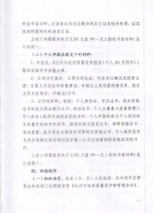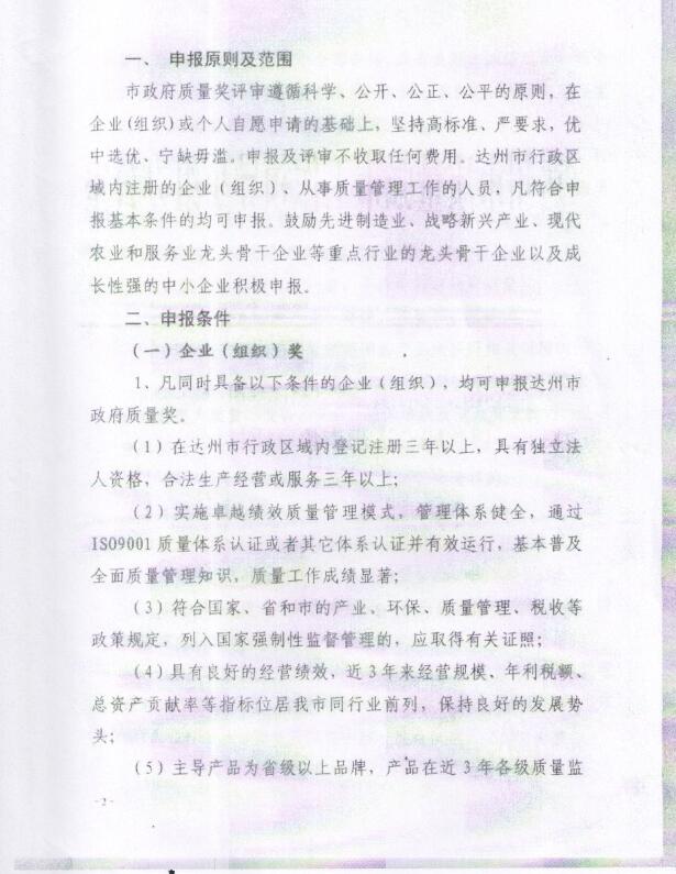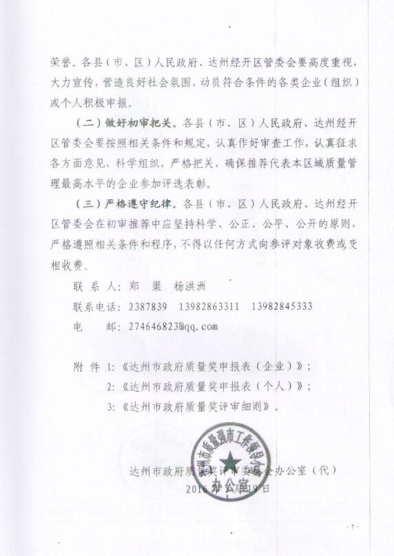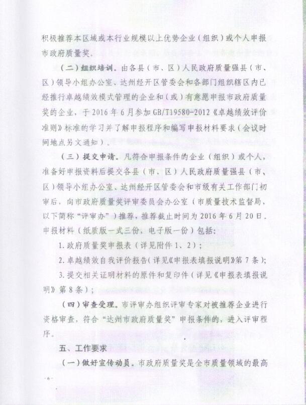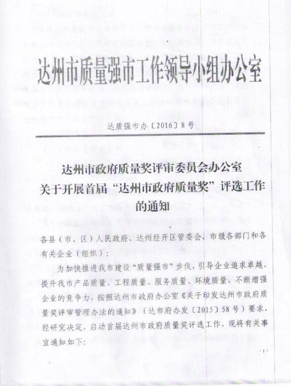 達州市政府質量獎評審委員會辦公室關于開展首屆“達州市政府質量獎”評選工作的通知