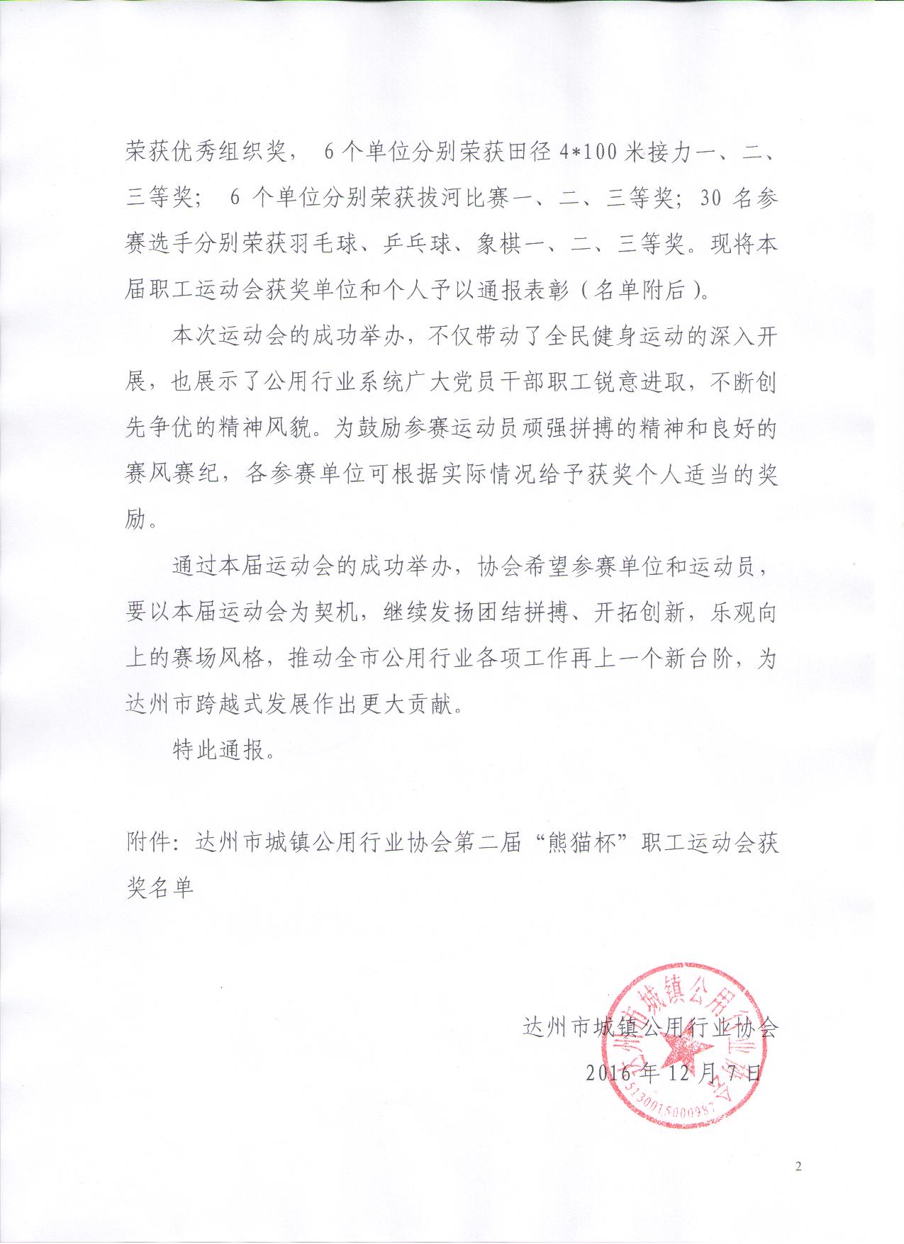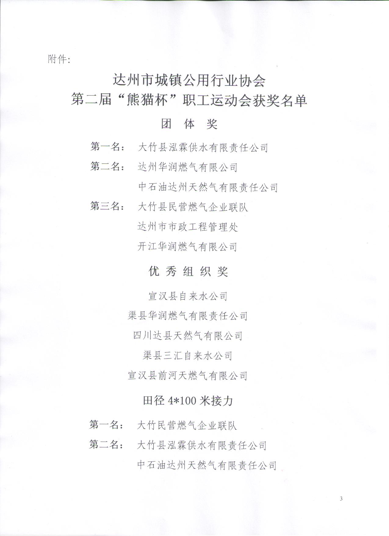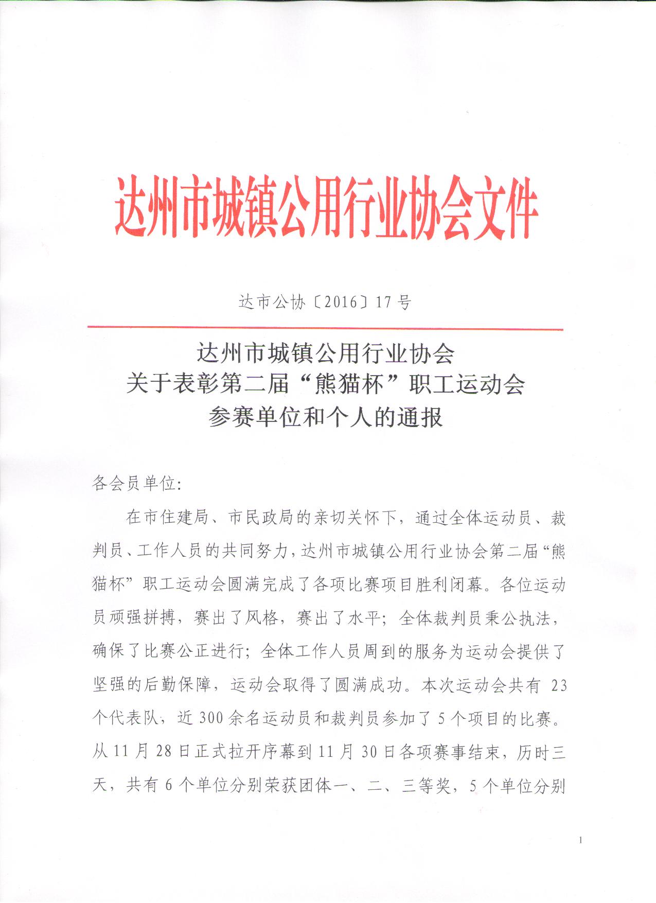 達(dá)州市城鎮(zhèn)公用行業(yè)協(xié)會(huì)關(guān)于表彰第二屆“熊貓杯”職工運(yùn)動(dòng)會(huì)參賽單位和個(gè)人的通報(bào)