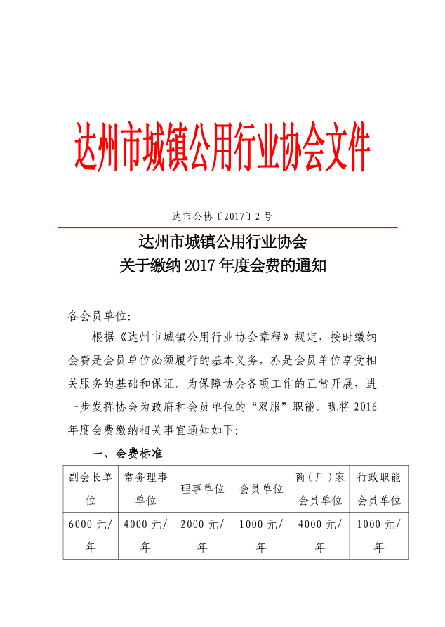 達州市公用行業(yè)協(xié)會關(guān)于繳納2017年度會費的通知