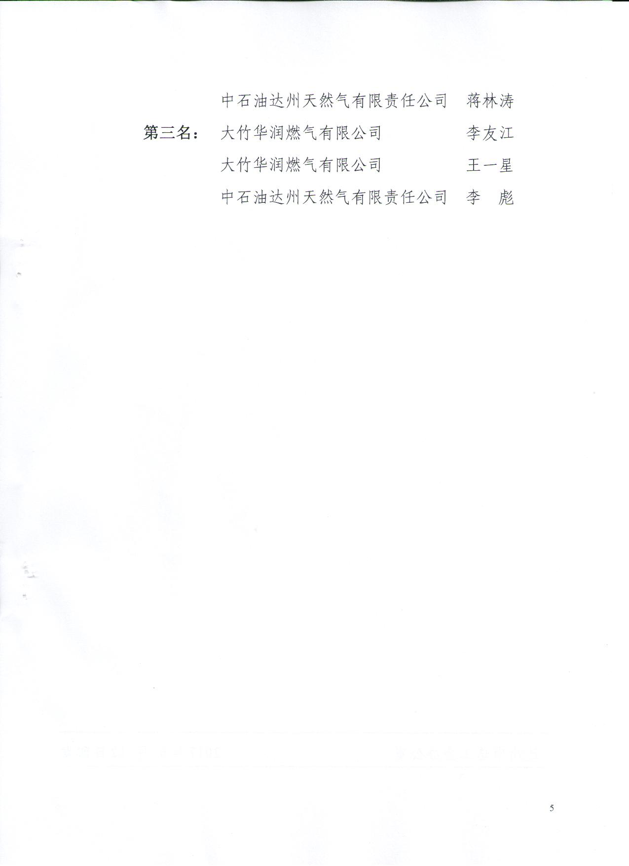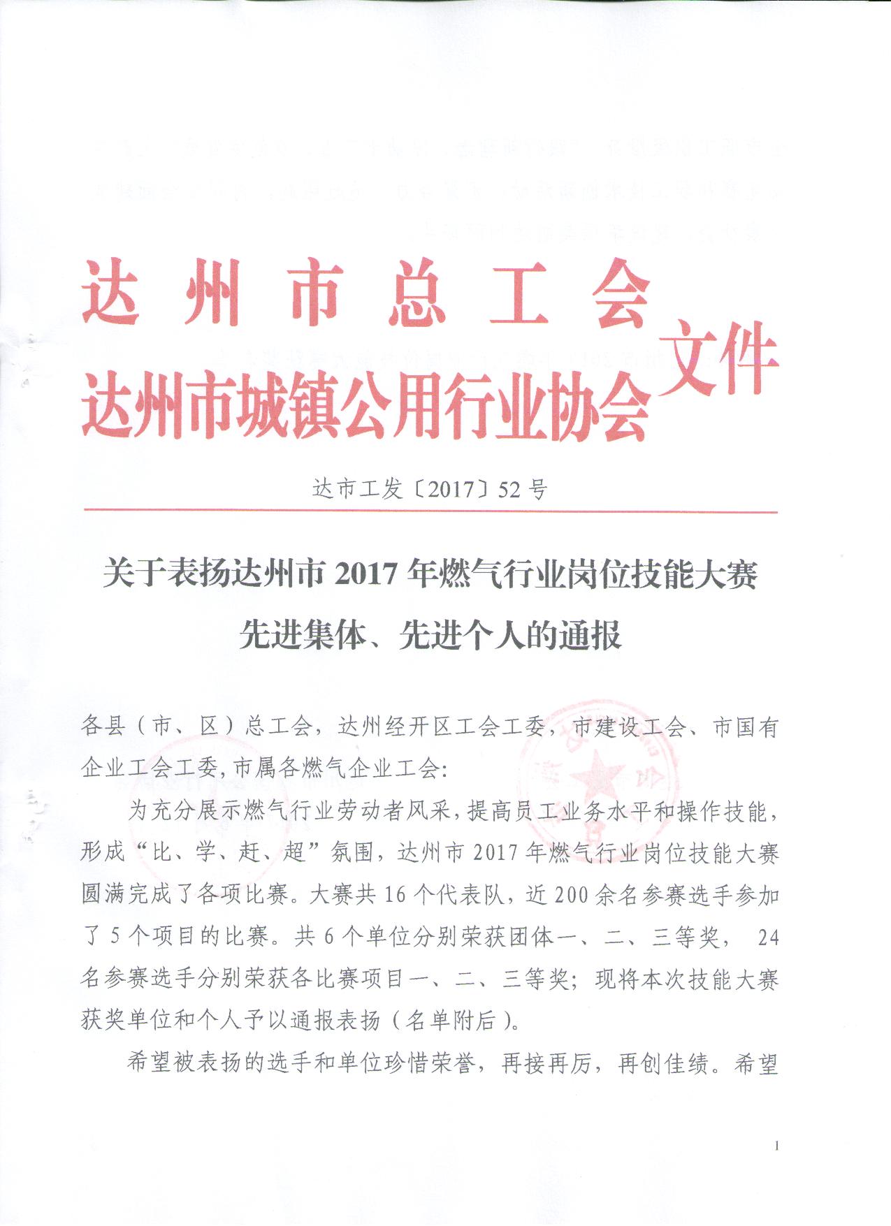 關(guān)于表揚(yáng)2017年達(dá)州市燃?xì)庑袠I(yè)崗位技能大賽先進(jìn)集體、先進(jìn)個人的通報