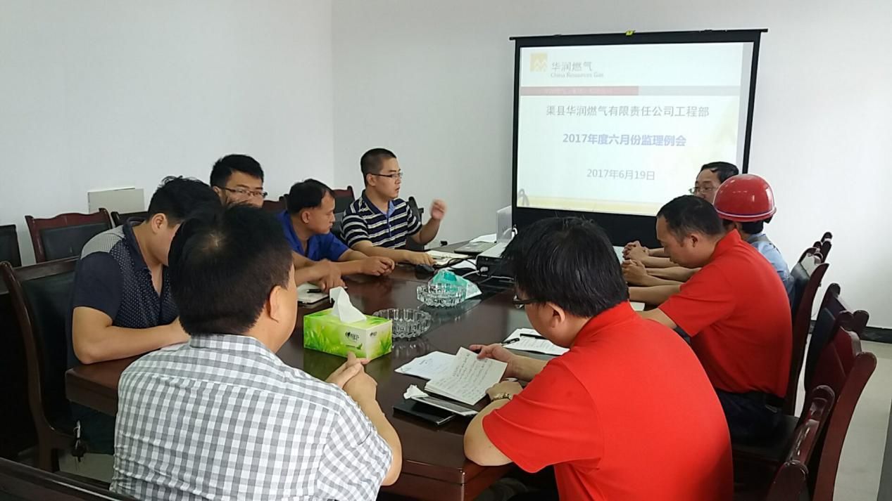 2017年6月19日上午9:30分,渠縣華潤(rùn)燃?xì)庥邢挢?zé)任公司分管領(lǐng)導(dǎo)、工程部人員及相關(guān)單位員工在該公司二樓臨時(shí)會(huì)議室召開了6月份監(jiān)理工作例會(huì)。渠縣華潤(rùn)燃?xì)飧笨偨?jīng)理吳開國(guó)總;渠縣華潤(rùn)燃?xì)夤こ滩繌堄隆㈥悤员、譚茂波、王清華、王禹棚;四川華達(dá)建設(shè)工程管理有限公司熊建;成都華潤(rùn)燃?xì)夤こ逃邢薰局芷健⒘_含;中色十二冶金建設(shè)有限公司劉漢宇、張清峰共11人參加會(huì)議,此次會(huì)議由該公司黨支部副書記、副總經(jīng)理吳開國(guó)總主持。