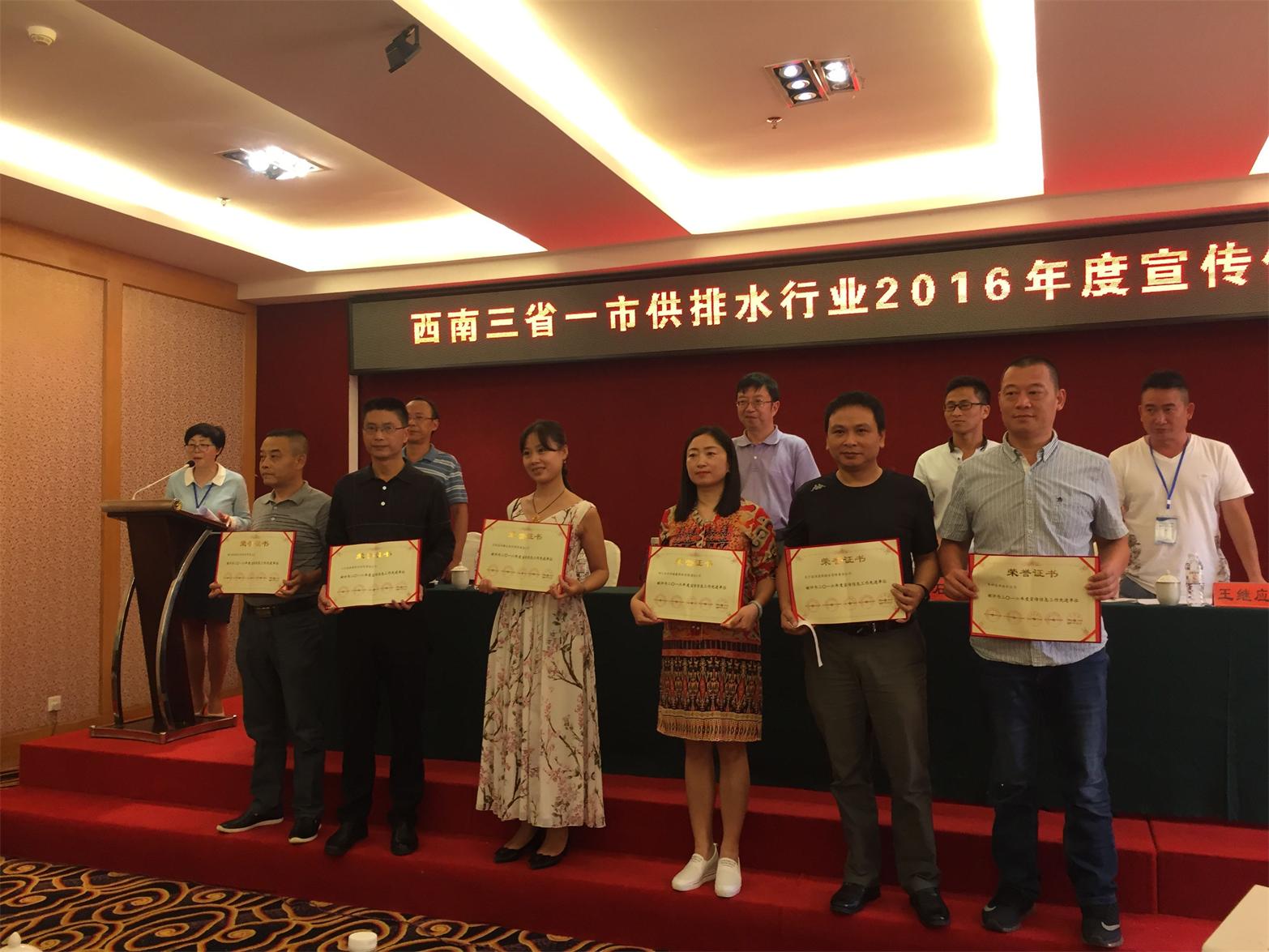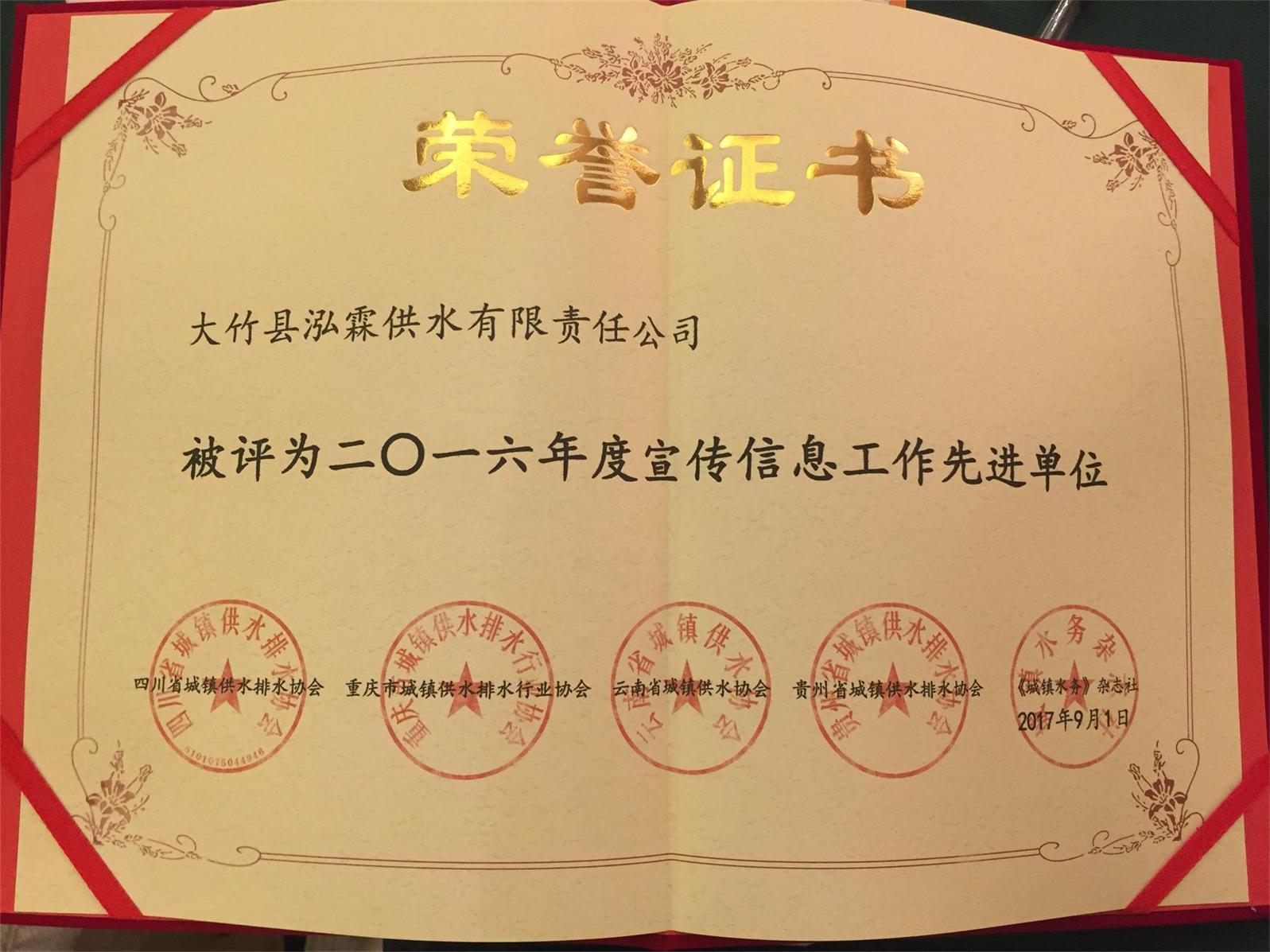 泓霖供水公司宣傳信息工作再傳捷報(bào)。繼8月份公司兩名通訊員被《中國供水節(jié)水》報(bào)社表彰為“2015-2017年度優(yōu)秀通訊員”后,近日,公司宣傳信息工作再傳捷報(bào),公司被四川省城鎮(zhèn)供水排水協(xié)會(huì)、重慶市城鎮(zhèn)供水排水協(xié)會(huì)、云南省城鎮(zhèn)供水協(xié)會(huì)、貴州省城鎮(zhèn)供水排水協(xié)會(huì)、《城鎮(zhèn)水務(wù)》雜志社聯(lián)合表彰為“2016年度宣傳信息工作先進(jìn)單位”。這是自2016年三省一市供排水協(xié)會(huì)及《城鎮(zhèn)水務(wù)》雜志首次聯(lián)合表彰宣傳信息工作先進(jìn)單位以來公司第二次獲此殊榮。