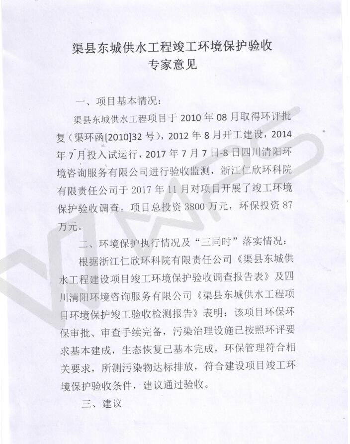 2017年12月18日,渠縣供水排水總公司組織環(huán)評單位(成都市環(huán)境保護(hù)科學(xué)研究院)、設(shè)計(jì)單位(渠縣供排水總公司)、施工單位(渠縣供排水總公司)、驗(yàn)收調(diào)查單位(浙江仁欣環(huán)科院有限責(zé)任公司)及渠縣環(huán)境監(jiān)測站3名專家(名單附后)組成驗(yàn)收組對渠縣東城供水工程建設(shè)項(xiàng)目竣工環(huán)境保護(hù)情況進(jìn)行了現(xiàn)場核查驗(yàn)收。驗(yàn)收組對建設(shè)項(xiàng)目現(xiàn)場進(jìn)行了認(rèn)真核查,聽取了建設(shè)單位對工程環(huán)境保護(hù)落實(shí)情況的匯報(bào)及“三同時”執(zhí)行情況的匯報(bào),結(jié)合驗(yàn)收調(diào)查報(bào)告,經(jīng)認(rèn)真討論形成以下意見: