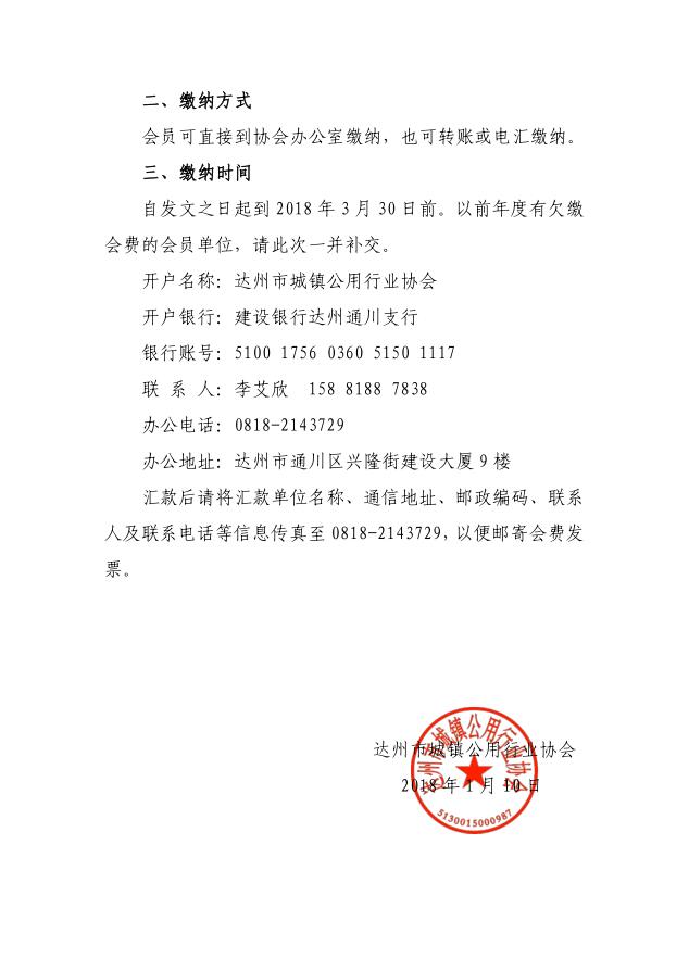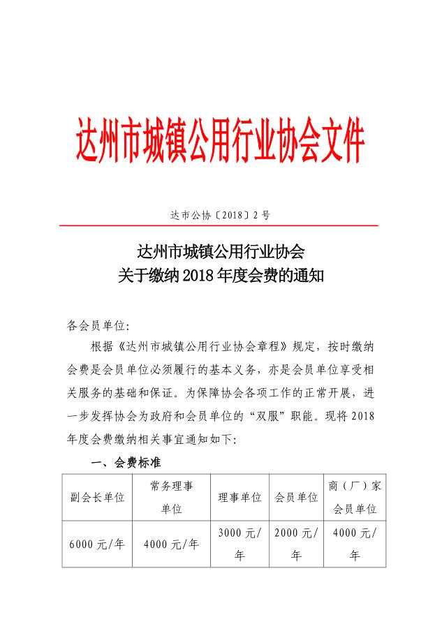 達(dá)州市城鎮(zhèn)公用行業(yè)協(xié)會(huì)關(guān)于繳納2018年度會(huì)費(fèi)的通知