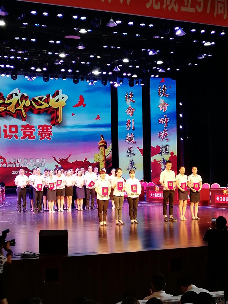 快訊 為慶祝中國共產(chǎn)黨建黨97周年,7月2日,達州市兩新組織在巴山大劇院隆重舉行了“黨在我心中”知識競賽決賽。達州市城鎮(zhèn)公用行業(yè)協(xié)會聯(lián)合黨支部朱芳玲(四川森博能源有限公司職工),黨建指導(dǎo)員、市委統(tǒng)戰(zhàn)部經(jīng)濟科科長黎秋,市現(xiàn)代物流行業(yè)協(xié)會副書記向琦等三同志代表市社會組織第二綜合黨委參加了知識競賽決賽,通過緊張激烈的競賽,獲得了二等獎的優(yōu)異成績,為社會組織第二綜合黨委和本單位爭得了榮譽。