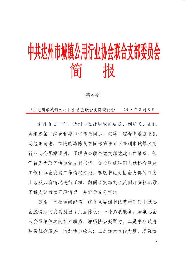 中共達(dá)州市城鎮(zhèn)公用行業(yè)協(xié)會聯(lián)合支部委員會2018年第四期簡報