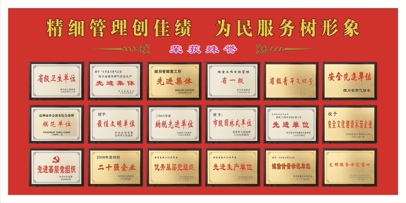 截止2017年底,連續(xù)17年被表彰為四川省“燃?xì)馄髽I(yè)安全生產(chǎn)先進(jìn)單位”,并先后榮獲省級“衛(wèi)生先進(jìn)單位”、“青年文明號”、安全文化建設(shè)示范企業(yè)、“安全生產(chǎn)先進(jìn)集體”、省一級檔案工作目標(biāo)管理達(dá),市級“最佳文明單位”、“綜合治理模范單位”、“園林式單位”、“納稅先進(jìn)單位”、“法律進(jìn)企業(yè)示范點(diǎn)”、“誠信守法示范企業(yè)”,縣級“先進(jìn)基層黨組織”、“二十強(qiáng)企業(yè)”、納稅大戶等榮譽(yù)稱號,并先后通過了ISO9002質(zhì)量體系認(rèn)證和OHSAS18001職業(yè)健康安全管理體系認(rèn)證。