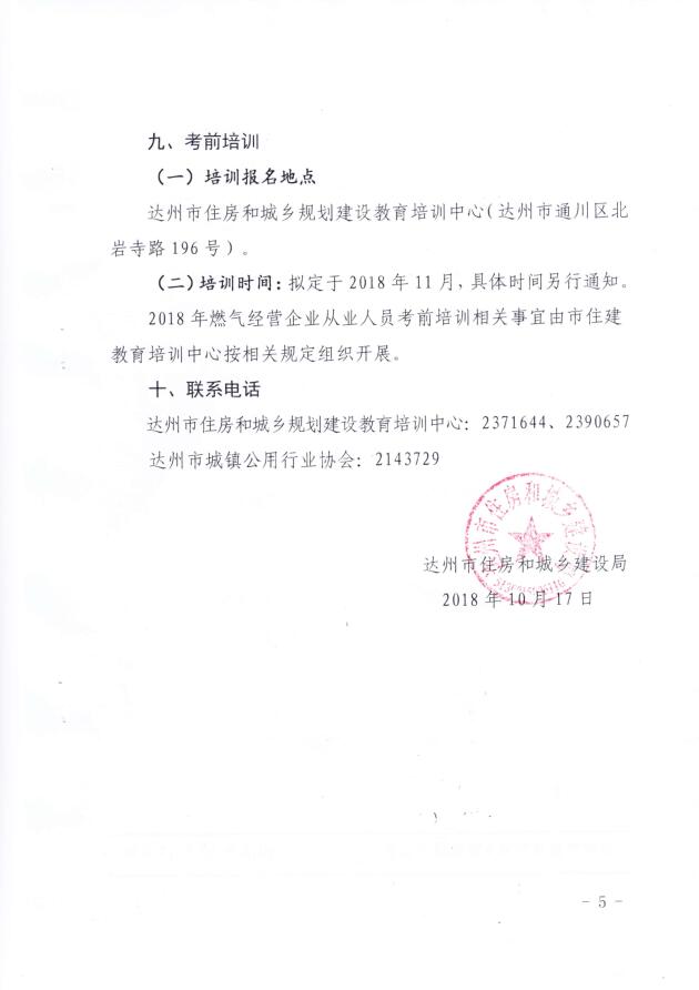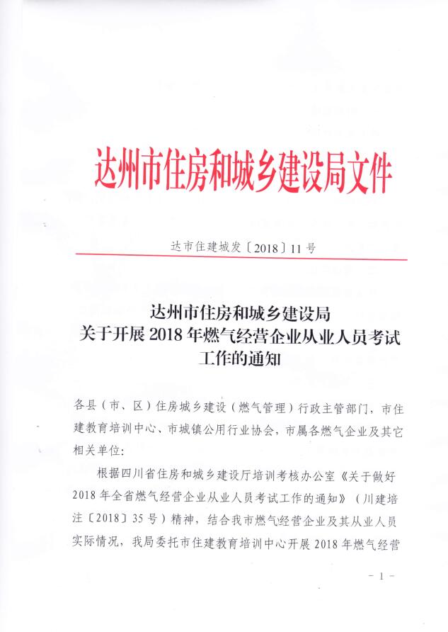 達(dá)州市住建局關(guān)于開展2018年燃?xì)饨?jīng)營企業(yè)從業(yè)人員考試工作的通知