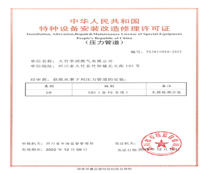 12月10日, 公司成功取得由四川省市場監(jiān)督管理局頒發(fā)的GB類GB1(含PE管專項(xiàng))特種設(shè)備安裝改造修理許可證。