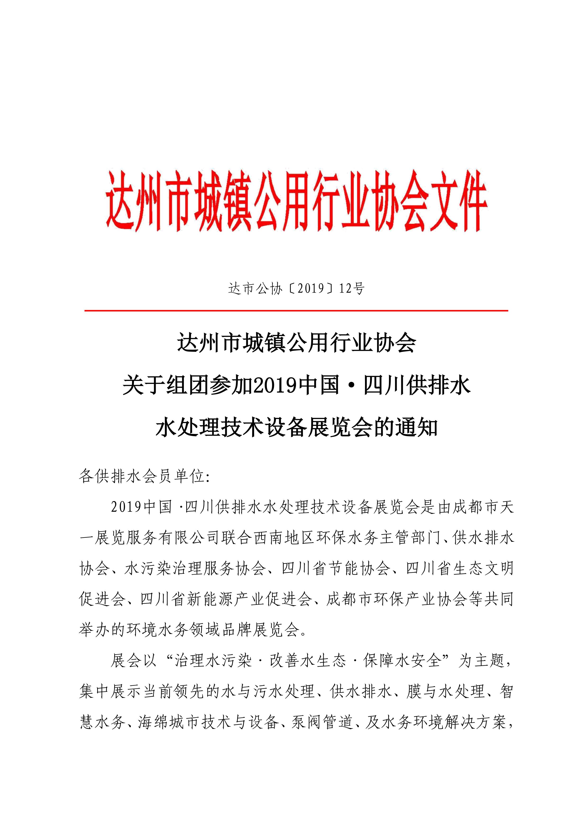 關(guān)于組團(tuán)參加2019中國(guó)•四川供排水水處理技術(shù)設(shè)備展覽會(huì)的通知