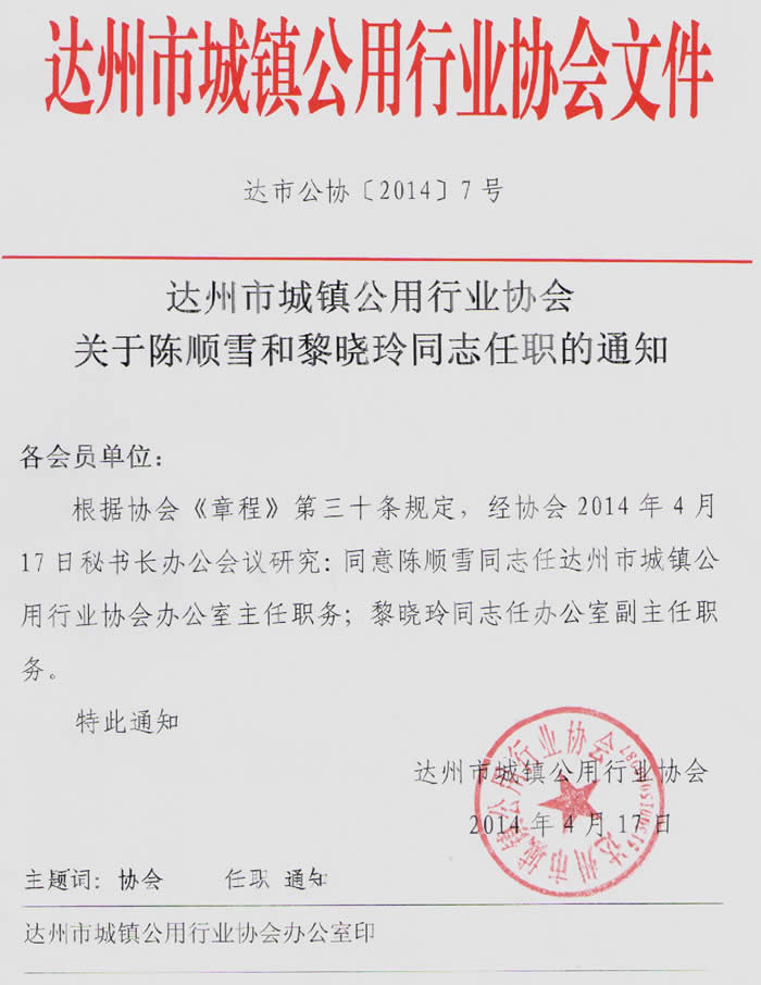 達(dá)州市城鎮(zhèn)公用行業(yè)協(xié)會(huì)關(guān)于陳順雪和黎曉玲同志任職的通知