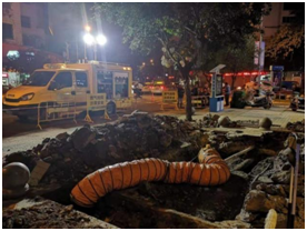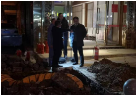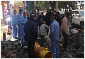 時間回放到12月4日上午8點40分,公司接到用戶報警,“洞天大酒店門口異味嚴重,疑似天然氣泄漏”。警情就是命令,搶險人員立即趕赴現(xiàn)場確認險情。通過初步查勘,現(xiàn)場無施工痕跡,周邊窨井可燃氣體濃度已達到爆炸極限,情況十分危急。公司接到現(xiàn)場反饋后,立即啟動搶險應急預案,迅速增派人員趕到燃氣泄漏區(qū)域,10余名搶修人員各司其責,疏散區(qū)域人員、建立警戒區(qū)域、布置警戒力量和消防設備、打探測孔、查找泄漏點、監(jiān)測周邊濃度、確定燃氣漏點、開啟鼓風置換裝備、實施開挖等工作有條不紊地同步進行。因漏氣現(xiàn)場各種管線(水、電、氣、通訊等)錯綜復雜,掩埋介質都為混凝土,周邊窨井、下水道濃度在爆炸極限內,無法機械破碎開挖。